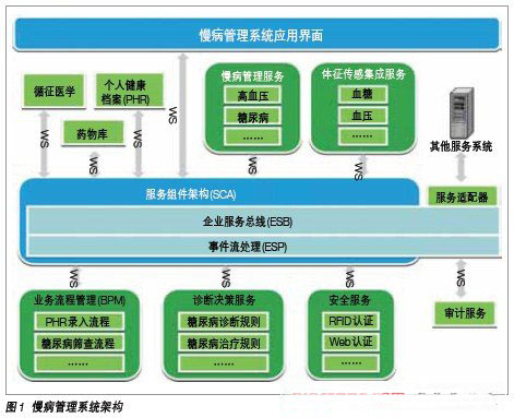 慢病管理系統(tǒng)的完整架構(gòu),強(qiáng)調(diào)了SOA架構(gòu)的靈活性和通用性。