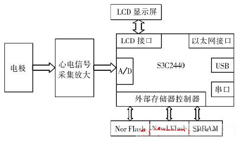 本系統(tǒng)采用S3C2440 處理器作為控制中心,S3C2440 是基于ARM920T 內(nèi)核的16 /32 位RISC 嵌入式處理器,最高主頻可達(dá)532MHz,提供64MSDRAM、64M Nand Flash 以及2M Nor Flash 的存儲(chǔ)設(shè)備,獨(dú)立的16kB 指令緩存和16kB 數(shù)據(jù)緩存,LCD 控制器,3通道的異步串口,SPI 同步串口,117 位通用的I /O 口,1個(gè)內(nèi)部時(shí)鐘,8通道10 位的ADC,觸摸屏接口,以太網(wǎng)控制器、PCMCIA 接口、USB 接口等,具有高性能、低功耗、高性價(jià)比等特點(diǎn),主要用于視頻會(huì)議、網(wǎng)絡(luò)監(jiān)控,GPS 定位/導(dǎo)航儀等,特別是醫(yī)療電子設(shè)備。系統(tǒng)的整體硬件結(jié)構(gòu)如圖1 所示,能夠?qū)崿F(xiàn)對(duì)心電信號(hào)采集、處理、顯示、存儲(chǔ)等功能。