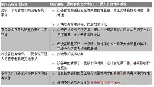 由于醫(yī)院不斷添購(gòu)新設(shè)備,輔助醫(yī)療和信息技術(shù)部門的工作人員每日面對(duì)的工作也不斷增加。有關(guān)的工作包括管理存貨、配置系統(tǒng)、載入修補(bǔ)程序、執(zhí)行防護(hù)功能、以及提供保修和維護(hù)服務(wù)。圖表1列出醫(yī)療設(shè)備工程師和信息技術(shù)工程師面對(duì)的問(wèn)題以及這些問(wèn)題對(duì)醫(yī)院日常運(yùn)營(yíng)所產(chǎn)生的影響。