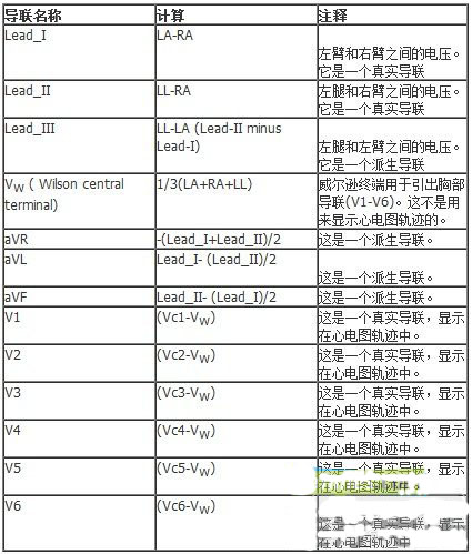 文中這個(gè)關(guān)于心電圖的術(shù)語“導(dǎo)聯(lián)(lead)”,指的是兩個(gè)電極間的電壓差,這就是設(shè)備記錄下來的差異。例如,“Lead_I”是左臂和右臂電極之間的電壓。Lead_I和Lead_II都指的是肢體導(dǎo)聯(lián)。V1-V6指的是胸部導(dǎo)聯(lián)。心電圖追蹤V1就是Vc1電壓(胸部電極的電壓),和Lead_I,Lead_II ,Lead_ III的平均電壓之間的差別。一個(gè)標(biāo)準(zhǔn)的十二導(dǎo)聯(lián)心電圖系統(tǒng)包括八個(gè)真實(shí)數(shù)值和四個(gè)派生值。表1給出了各種導(dǎo)聯(lián)電壓(真實(shí)的和派生的)的簡介。