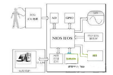 主要由心電信號(hào)的前端采集與調(diào)理模塊、心電信號(hào)處理與存儲(chǔ)模塊、數(shù)據(jù)顯示模塊和遠(yuǎn)程傳輸控制模塊等四個(gè)關(guān)鍵模塊組成,系統(tǒng)功能結(jié)構(gòu)如圖所示。其硬件平臺(tái)采用CycloneII 2C35 FPGA芯片,采用SOPC技術(shù)將NiosII軟核處理器、存儲(chǔ)器、功能接口和擴(kuò)展I/O口等集成在一塊FPGA芯片上,外圍擴(kuò)展心電數(shù)據(jù)采集板、網(wǎng)絡(luò)、LCD屏、觸摸屏/鍵盤、SD存儲(chǔ)卡等硬件來實(shí)現(xiàn)系統(tǒng)的硬件架構(gòu),且?guī)в锌蓴U(kuò)展的I/O接口,便于以后系統(tǒng)功能升級(jí)與擴(kuò)展。