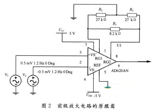 該放大器有較高的共模抑制比(CMRR),溫度穩(wěn)定性好,放大頻帶寬,噪聲系數(shù)小且具有調節(jié)方便的特點,是生物醫(yī)學信號放大的理想選擇。根據(jù)小信號放大器的設計原則,前級的增益不能設置太高,因為前級增益過高將不利于后續(xù)電路對噪聲的處理。