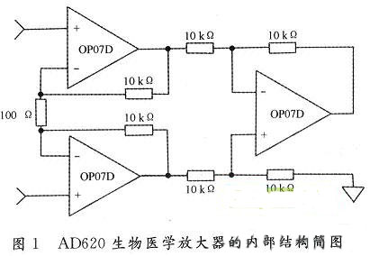為此,選用Analog公司的儀用放大器AD620作為前級(jí)放大(預(yù)放)。AD620的核心是三運(yùn)放電路(相當(dāng)于集成了三個(gè)OP07運(yùn)放),其內(nèi)部結(jié)構(gòu)如圖1所示。