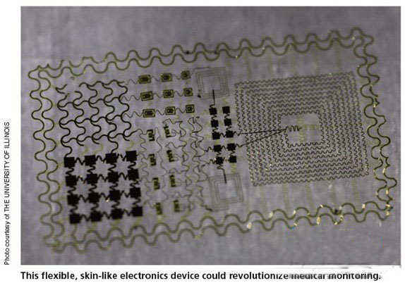 醫(yī)生們都希望能夠在病人離開醫(yī)院之后,仍能在其日常生活中對其病情進行監(jiān)測。隨著佩戴電子裝置取得突破,他們的這一愿望也許終將在某天成為現(xiàn)實。伊利諾大學(xué)( University of Illinois )材料科學(xué)工程教授John Rogers、加州大學(xué)圣地亞哥分校(University of California-San Diego)生物工程教授Todd Coleman和伊利諾伊州西北大學(xué)(Northwestern University)機械工程教授Yonggang Huang帶領(lǐng)研究小組開發(fā)出了一款安裝有微型電子元器件的薄且柔韌的裝置。