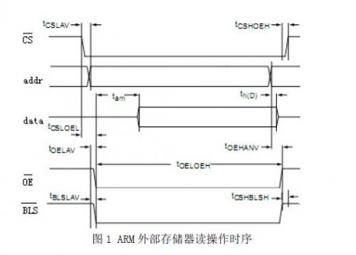 在本設(shè)計中,用到ARM 外部總線的信號有:CS.WE.OE.DATA[310].ADDR[230].BLS 等.CS 為片選信號,WE 為寫使能信號,OE 為讀使能信號,DATA 為數(shù)據(jù)總線,ADDR 地址總線,BLS 為字節(jié)組選擇信號.ARM 的外部總線讀操作時序圖,分別如圖1 所示.