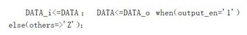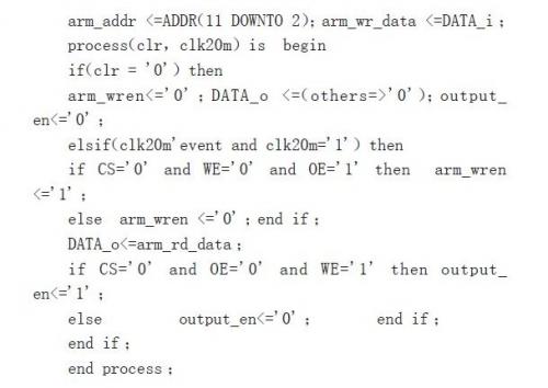 其中,DATA_i.DATA_o 和output_en 均為FPGA 內(nèi)部的信號,在內(nèi)部的各層次模塊中,通過這三個信號就可以進(jìn)行單向的IO 控制.這樣,頂層設(shè)計中雙向的DATA 端口轉(zhuǎn)化為了內(nèi)部單向的DATA_i(輸入).DATA_o(輸出)和output_en(輸出使能).在內(nèi)部各模塊中,結(jié)合這三個信號以及 ADDR.OE.WE.CS 等信號,則可方便地實現(xiàn)ARM 總線接口的功能.實現(xiàn)的VHDL 關(guān)鍵代碼如下: