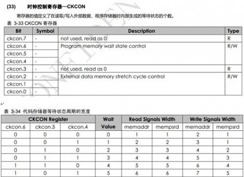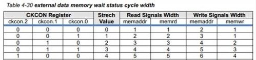 CKCON主要作用是設置存儲器地址總線memaddr[22:0]和讀寫memwr/ memerd信號的寬度,已實現(xiàn)對不同外設時序的操作,若寬度仍不夠,也可以通過memack實現(xiàn)硬件延時,理論上可以實現(xiàn)任意寬度的地址總線地址和讀寫信號。