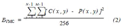 設(shè)參考宏塊的像素值(Y分量值,以下同)用P(x,y)表示,當(dāng)前宏塊的像素值用C(x,y)表示,x,y表示宏塊的縱、橫坐標(biāo),M,N表示宏塊的寬和高。當(dāng)前宏塊像素值的方差用EVAR表示,其值為