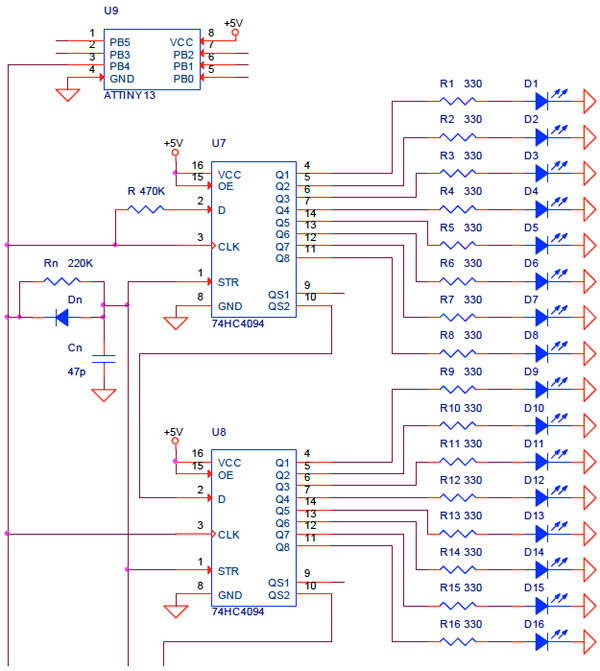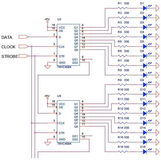 圖3:一個(gè)微控制器端口控制移位寄存器的數(shù)據(jù)和時(shí)鐘輸入。處于未激活狀態(tài)的選通脈沖輸入連接至5V電壓(邏輯1)。