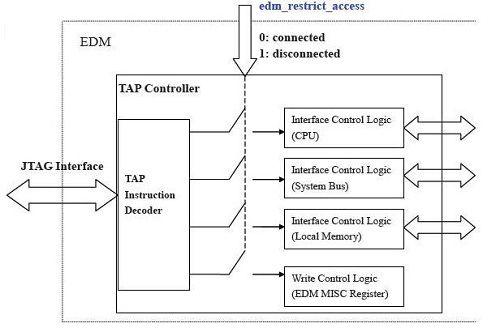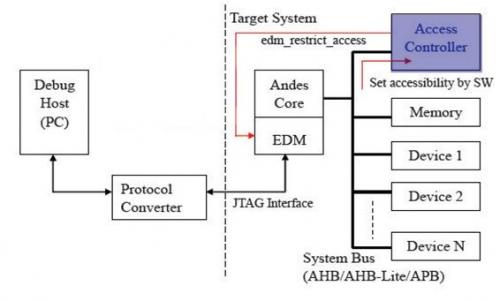EDM安全存取是AndesCore 內(nèi)建的功能(option),應(yīng)用在安全存取的控管。EDM安全存取有二種的控管方式:debug access indication和EDM access restriction.第一種控管方式(debug access indication)提供了一個sideband signal用于指示從調(diào)試器(Debug host)的請求。第二種控管方式, 控制AndesCore的input port(edm_restrict_access )達(dá)到EDM存取的限制。更詳細(xì)的內(nèi)容在后續(xù)章節(jié)會有更深入的介紹。