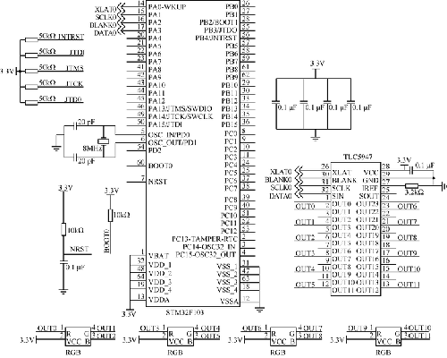 STM32F103通過(guò)TLC5947與LED連接[3],用來(lái)控制旋轉(zhuǎn)板上LED燈的顯示。例如可以通過(guò)單片機(jī)STM32F103控制LED燈旋轉(zhuǎn)顯示時(shí)鐘模樣或各種圖形[4],如果條件允許的話,可以顯示一些簡(jiǎn)單的游戲。LED與ARM處理器相連接,通過(guò)ARM處理器對(duì)觸摸信號(hào)的處理來(lái)實(shí)現(xiàn)LED燈的顯示樣式的變化,從基態(tài)的指針式時(shí)鐘變?yōu)閿?shù)字顯示式以及改變其顯示的背景,還可以進(jìn)行時(shí)間的校準(zhǔn)操作。TLC5947驅(qū)動(dòng)旋轉(zhuǎn)LED屏顯示控制電路如圖1所示[5]。