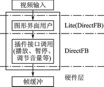 嵌入式播放器的架構(gòu)如圖2所示。采用DirectFB開發(fā)的Lite作為圖形界面,與用戶進(jìn)行直接交互;調(diào)用DirectFB的Video實(shí)現(xiàn)了音視頻的插件接口和解碼器模塊。該接口將FFmpeg、xine 、libmpeg3等多媒體庫封裝成統(tǒng)一接口,具備很強(qiáng)的擴(kuò)展性;基于Framebuffer的輸出,消除了對于特定架構(gòu)的依賴,有效地增強(qiáng)了系統(tǒng)的可移植性。