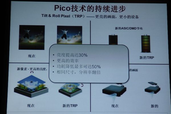 今年TI發(fā)布了兩項新一代的技術(shù):首先是像素架構(gòu)Tilt & Roll Pixel(TRP)。其將DLP整個像素的尺寸進一步降低,帶來兩個特點:第一,現(xiàn)在更小的面板可以實現(xiàn)原來的分辨率,更小的面積使得光學模塊可以做得更加緊湊;第二,TRP實現(xiàn)了復雜的偏轉(zhuǎn)方式,使像素有更高的光學效率,即使是光源在其他條件不變的情況下,亮度得到進一步提升。它在不損失體積或功率的情況下,提升了亮度。