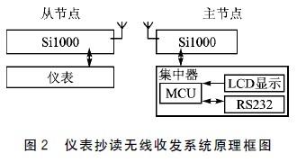 儀表抄讀無線收發(fā)系統(tǒng)原理框圖如圖2所示。無線數(shù)據(jù)的收發(fā)由無線微控制器Si1000實現(xiàn)。主節(jié)點Si1000內(nèi)部的發(fā)送模塊將數(shù)據(jù)進(jìn)行編碼處理,以特定的格式經(jīng)天線發(fā)送給接收模塊。從節(jié)點Si1000內(nèi)部的接收模塊接收到有效數(shù)據(jù)后,Si1000內(nèi)部的微處理器通過擴(kuò)展接口讀取外部儀表的數(shù)據(jù),并進(jìn)行相應(yīng)的調(diào)整、轉(zhuǎn)換處理后通過射頻發(fā)送給主節(jié)點。主節(jié)點通過GPRS與集抄中心進(jìn)行通信。