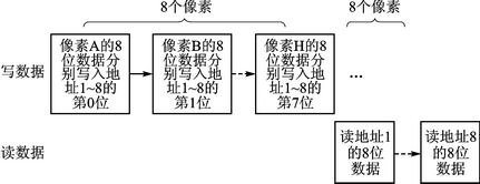 數(shù)據(jù)寫(xiě)入SRAM存儲(chǔ)器中的組織方式有兩種:位平面法和組合像素法。位平面法是指像素的每一位分別存放在不同的存儲(chǔ)設(shè)備中;組合像素法是指畫(huà)面上每個(gè)像素的所有位均集中存放在單個(gè)存儲(chǔ)設(shè)備中。LED屏像素?cái)?shù)據(jù)每一位的權(quán)值是不同的,高位的權(quán)值高,也就意味著高位為1時(shí)LED的點(diǎn)亮?xí)r間要長(zhǎng)。根據(jù)兩種存儲(chǔ)結(jié)構(gòu)的特點(diǎn),對(duì)于LED屏,采用位平面結(jié)構(gòu)有利于提高LED屏的顯示效果,從而更容易實(shí)現(xiàn)D/T(data to time)轉(zhuǎn)換。位平面法的數(shù)據(jù)需要重新組織,利用位平面結(jié)構(gòu)有利于提高LED屏的顯示效果。數(shù)據(jù)重構(gòu)示意圖如圖2所示。