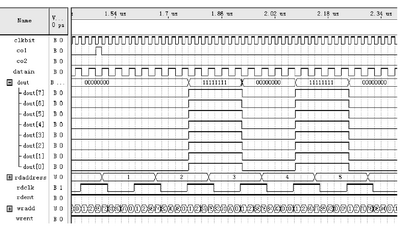 數(shù)據(jù)重構(gòu)后,通過(guò)QuartusⅡ軟件編譯,得出如圖3所示仿真波形。其中,當(dāng)col為1時(shí),表示已寫(xiě)完上面8個(gè)地址的數(shù)據(jù),此時(shí)讀地址計(jì)數(shù)器開(kāi)始計(jì)數(shù)。datain為串行輸入數(shù)據(jù),dout為串行輸出數(shù)據(jù)。