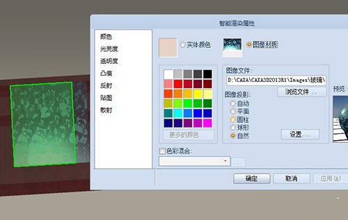 接下來(lái),選中一塊玻璃的表面(變綠色),右鍵選擇【智能渲染】,在圖像文件選項(xiàng)下找到玻璃圖片保存的路徑,選擇圖片點(diǎn)擊確定。這樣,一塊玻璃就建成了,同樣的方法,將另外一塊玻璃渲染出來(lái),如圖3所示。