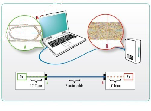 為滿足兼容性要求,USB3.0線材信號必須可以通過3米長的線纜,并保持信號眼圖開口有足夠的寬度。但這只是部分的路徑,因為在兼容性測試中測量的是接收器經(jīng)過均衡化處理過后的信號。舉例來說,在一般的筆記本電腦架構中,USB控制芯片到連接器的距離大約是10英寸,因此信號實際上可能另外經(jīng)過大約半米的路徑和數(shù)個連接器。