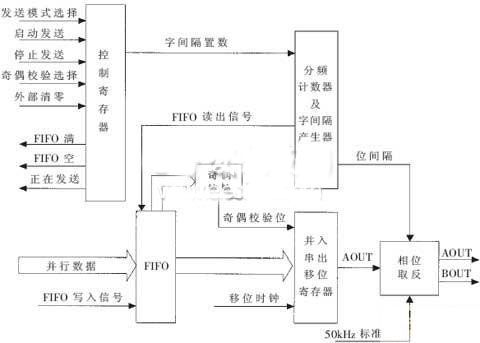 發(fā)送部分的主要功能是將DSP送入的數(shù)據(jù)暫存在FPGA內(nèi)部的FIFO中,等待發(fā)送命令。一旦接到發(fā)送控制指令,F(xiàn)IFO輸出數(shù)據(jù)并通過并/串轉(zhuǎn)換將并行數(shù)據(jù)轉(zhuǎn)換為串行數(shù)據(jù),同時加入預(yù)先設(shè)定的間隔。用戶可通過寫控制寄存器選擇發(fā)送模式(即單幀發(fā)送或自動重復(fù)發(fā)送)、發(fā)送通道延遲設(shè)定、發(fā)送通道字間隔設(shè)定,還可通過讀取狀態(tài)位檢查它的工作狀態(tài)(發(fā)送緩沖器空、發(fā)送緩沖器滿和是否正在發(fā)送)。發(fā)送模塊結(jié)構(gòu)框圖如圖4所示。