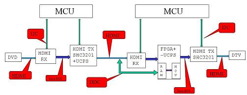 接收端系統(tǒng)工作方法:由于現(xiàn)還沒有UCPS的接收器,所以采用一種組合方式來實現(xiàn)UCPS接收功能。首先由一個HDMI接收器(無UCPS功能的HDMI接收器)接收SHC3201發(fā)送過來的加密視頻數(shù)據(jù),再將視頻數(shù)據(jù)送入FPGA中,F(xiàn)PGA板只做UCPS解密操作,F(xiàn)PGA解密后將視頻數(shù)據(jù)送入SHC3201(此處shc3201只是一個HDMI發(fā)送器,無UCPS功能)。SHC3201再將數(shù)據(jù)通過HDMI線送到DTV。整個系統(tǒng)工作結(jié)束。