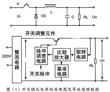 圖(1)畫出了開關(guān)穩(wěn)壓電源的原理圖及等效原理框圖,它是由全波整流器,開關(guān)管Vi,激勵(lì)信號(hào),續(xù)流二極管VD,儲(chǔ)能電感和濾波電容C組成。實(shí)際上,開關(guān)穩(wěn)壓電源的核心部分是一個(gè)直流變壓器。這里我們對(duì)直流變換器和逆變器作如下解釋。逆變器,它是把直流轉(zhuǎn)變?yōu)榻涣鞯难b置。逆變器通常被廣泛地應(yīng)用在采用電平或電池組成的備用電源中。直流變換器,它是把直流轉(zhuǎn)換成交流,然后又把交流轉(zhuǎn)換成直流的裝置。這種裝置被廣泛地應(yīng)用在開關(guān)穩(wěn)壓電源中。采用直流變換器可以把一種直流供電電壓變換成極性、數(shù)值各不同的多種直流供電電壓。