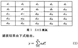 這里的dki是25個輸入統(tǒng)計(jì)量,常數(shù)ai可以根據(jù)具體問題進(jìn)行選擇。中值濾波是當(dāng)式(1)的系數(shù)狳了a13以外的ai均取零時(shí)的一種特殊情況。當(dāng)噪聲點(diǎn)數(shù)量少手窗中抽樣的一半時(shí),中值濾波是非常有效的。