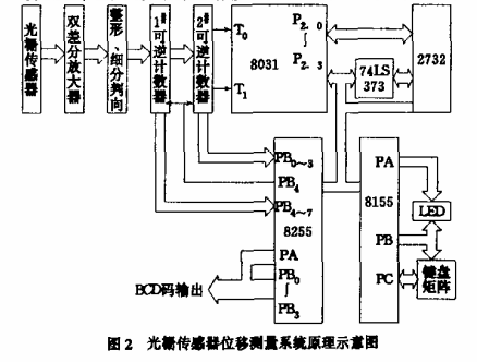 圖 2是利用光柵傳感器構(gòu)成的位移量自動測量系統(tǒng)原理示意圖。該系統(tǒng)采用光柵移動產(chǎn)生的莫爾條紋與電子電路以及單片機相結(jié)合來完成對位移量的自動測量,它具有判別光柵移動方向、預(yù)置初值、實現(xiàn)自動定位控制及過限報警、自檢和掉電保護以及溫度誤差修正等功能。下面對該系統(tǒng)的工作原理及設(shè)計思想作以介紹。