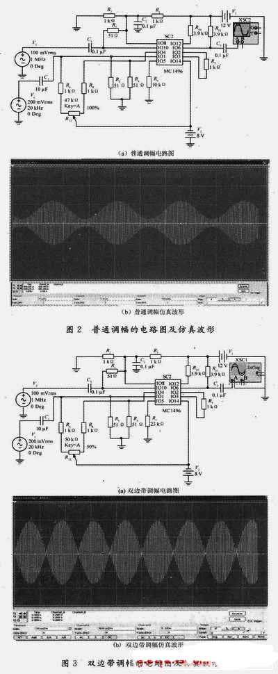 在授課過(guò)程中,對(duì)于電路進(jìn)行理論分析的同時(shí),可通過(guò)Multisim,EWB,PSPICE,SystemView等仿真軟件輔以生動(dòng)的仿真演示,實(shí)現(xiàn)理論講解和驗(yàn)證的同步進(jìn)行,不僅能增強(qiáng)教學(xué)的直觀性與靈活性,而且能夠最大限度地利用有限的授課學(xué)時(shí),加深學(xué)生對(duì)基本理論知識(shí)的理解,為傳統(tǒng)的教學(xué)方法注入活力。例如,可采用非線性器件所構(gòu)造的模擬乘法器MC1496來(lái)實(shí)現(xiàn)信號(hào)調(diào)幅、檢波、混頻、鑒相等電路,其原理在很多文獻(xiàn)書籍當(dāng)中均有描述,通過(guò)仿真演示可使學(xué)生更加直觀的了解。