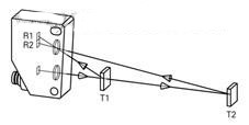 帶背景抑制的漫反射式傳感器不僅可以分析入射光的強(qiáng)度,同時(shí)也能分析物體反射光的入射角。反過(guò)來(lái),該入射角僅由物體與傳感器之間的距離(T1或T2)決定,然后由位置敏感的接收器元件將對(duì)該位置(R1,R2)進(jìn)行估算。