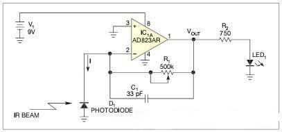 放大器IC1A配置為一個(gè)光伏放大器。當(dāng)IR光能作用到光電二極管D1上時(shí),D1生成一個(gè)小的光電流,它嘗試將反相輸入端拉至負(fù)值。同時(shí),IC1A的輸出變?yōu)檎担瑢⒎糯笃鱌in2的虛擬地結(jié)點(diǎn)保持在0V.電路的傳輸函數(shù)為VOUT=I×R1.如果設(shè)定增益為高,則當(dāng)電路檢測(cè)到光時(shí),IC1A變至電源軌。Analog Devices公司的AD823AR JFET輸入放大器通過(guò)一個(gè)750Ω的限流電阻直接驅(qū)動(dòng)LED.C1為放大器做補(bǔ)償,防止其由于D1的電容負(fù)載以及輸入寄生電容而產(chǎn)生振蕩。