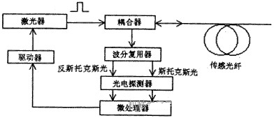因而這一關系與光時域反射技術結合就可構成分布式溫度傳感器。圖2是該類傳感器的基本結構框圖。采用斯托克斯光與反斯托克斯光的強度比可消除光纖的固有損耗和不均勻性所帶來的影響。