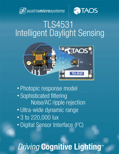 新的傳感器系列由2011年被奧地利微電子收購(gòu)的全球領(lǐng)先智能照明傳感器提供商TAOS所研發(fā),可提供從3勒克斯至220,000勒克斯的動(dòng)態(tài)范圍,可防止直射陽(yáng)光下的傳感器輸出飽和,并通過(guò)運(yùn)用適光反應(yīng)模型使傳感器的輸出與人眼的感知一致。