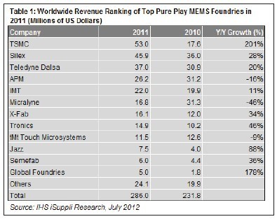 在12家提供MEMS制造業(yè)務(wù)的純代工廠商中,臺積電名列前茅。除了臺積電以外,去年MEMS營業(yè)收入增長的其它代工廠商包括Silex Microsystems、Teledyne Dalsa、Innovative Micro Technology、X-Fab, Tronics、Jazz Semiconductor、Semefab和GlobalFoundries。營業(yè)收入下滑的廠商是Asia-Paci?c Microsystems、Micralyne和tMt Touch Microsystems,如表1所示。
