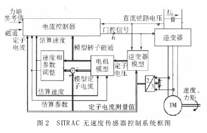 圖 2 是 SITRAC 無速度傳感器控制系統(tǒng)的框圖。此控制模型圖解了一個完整的逆變器模型, 圖中的電機模型是用來為電流控制器計算機械設備模型的定子電流和磁通空間矢量。電機模型的輸入僅僅是定子電壓空間矢量和估算速度以及同樣是估算值的機械參數。在這個系統(tǒng)中電機電壓不是由測量得到而是通過逆變器門控信號、直流電壓測量值、電機電流和相關的 IGBT 參數重新構建。電機速度是通過電流空間矢量測量值和模型定子電流空間矢量進行比較而估算得到。