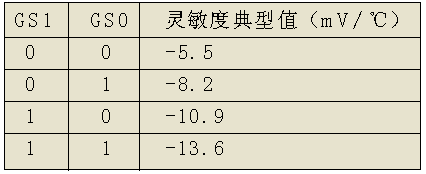 LM94022根據(jù)GS0、GS1被施加的不同電平有4種靈敏度供用戶(hù)選擇,如表2所示。用戶(hù)可根據(jù)測(cè)溫的范圍及接口電路的工作電壓的條件來(lái)合理選擇。靈敏度由GS0及GS1的電平確定:高電平要求大于(VDD-0.5V);低電平要求小于0.5V。