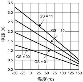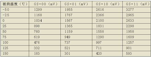 從圖2可看出,其線(xiàn)性度極好,這是線(xiàn)性化后的特性。按表3的數(shù)據(jù)計(jì)算出的靈敏度值與表2給出的典型靈敏度有一些差值。例如,在GS=00時(shí),-25℃時(shí)的輸出電壓為1168mV,-50℃時(shí)的輸出電壓為1299mV,則其平均靈敏度為-5.24mV/℃;50℃時(shí)的輸出電壓為760mV,75℃時(shí)的輸出電壓為619mV,則其平均靈敏度為5.64mV/℃。表2中GS=00時(shí),靈敏度為-5.5mV/℃。