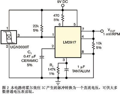 圖2中的電路將來自霍爾效應(yīng)的脈沖轉(zhuǎn)換為一個(gè)直流電壓,多數(shù)普通電壓計(jì)就可以讀取?;魻栃?yīng)IC提供的是集電極開路輸出。你只需要一只上拉電阻。傳感器對產(chǎn)生的系列脈沖作轉(zhuǎn)換,用美國國家半導(dǎo)體公司的LM2917頻率-電壓轉(zhuǎn)換器轉(zhuǎn)成電壓。選擇C1和R1,根據(jù)本器件電荷泵部分會遇到的頻率范圍調(diào)整輸出電壓。對一個(gè)四沖程的單缸引擎,到5000 r/min就足夠了。