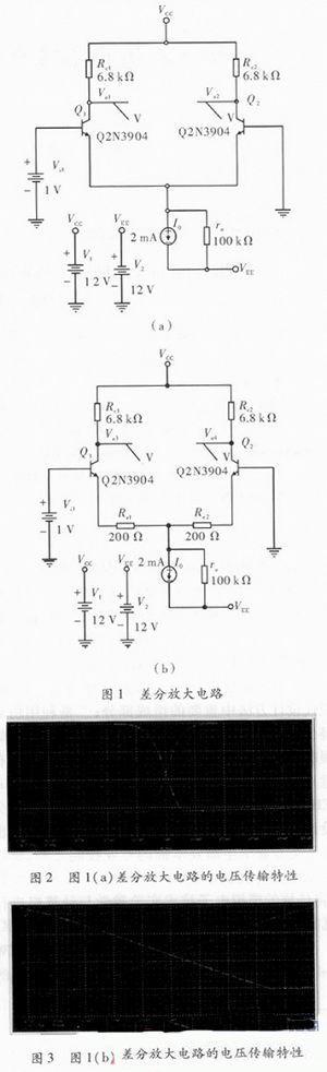 對比分析圖2和圖3可知,圖1(b)中差分電路引入負反饋后(Re1=Re2=200 Ω)增加了放大電路的線性工作區(qū),但傳輸特性的斜率變小,使放大電路的增益減小。采用PSpice仿真軟件可方便得出差分電路的電壓傳輸特性曲線,若采用物理實驗的方法,則需對輸入電壓Vi1取一系列值,列表分別測輸出電壓,再根據(jù)所測的數(shù)據(jù)繪制電壓傳輸特性曲線。